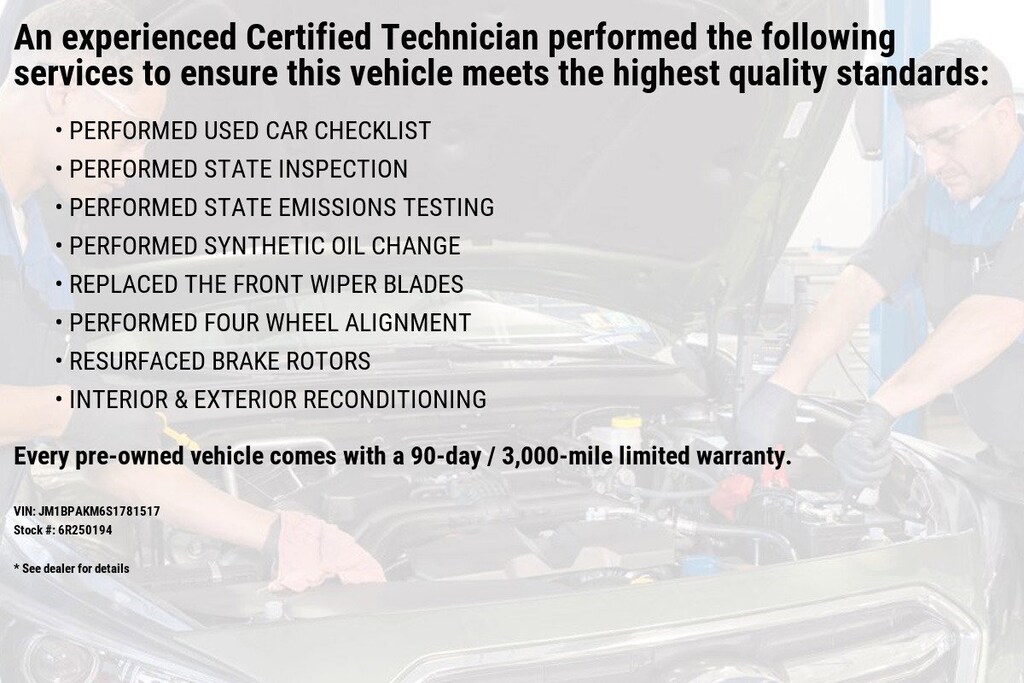 Each vehicle is required to endure an uncompromising 160-point inspection inside and out, performed by a factory-trained Mazda technician. Below are just a few inspection highlights: