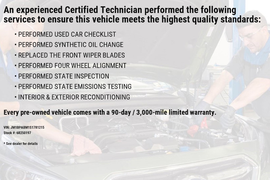 Each vehicle is required to endure an uncompromising 160-point inspection inside and out, performed by a factory-trained Mazda technician. Below are just a few inspection highlights: